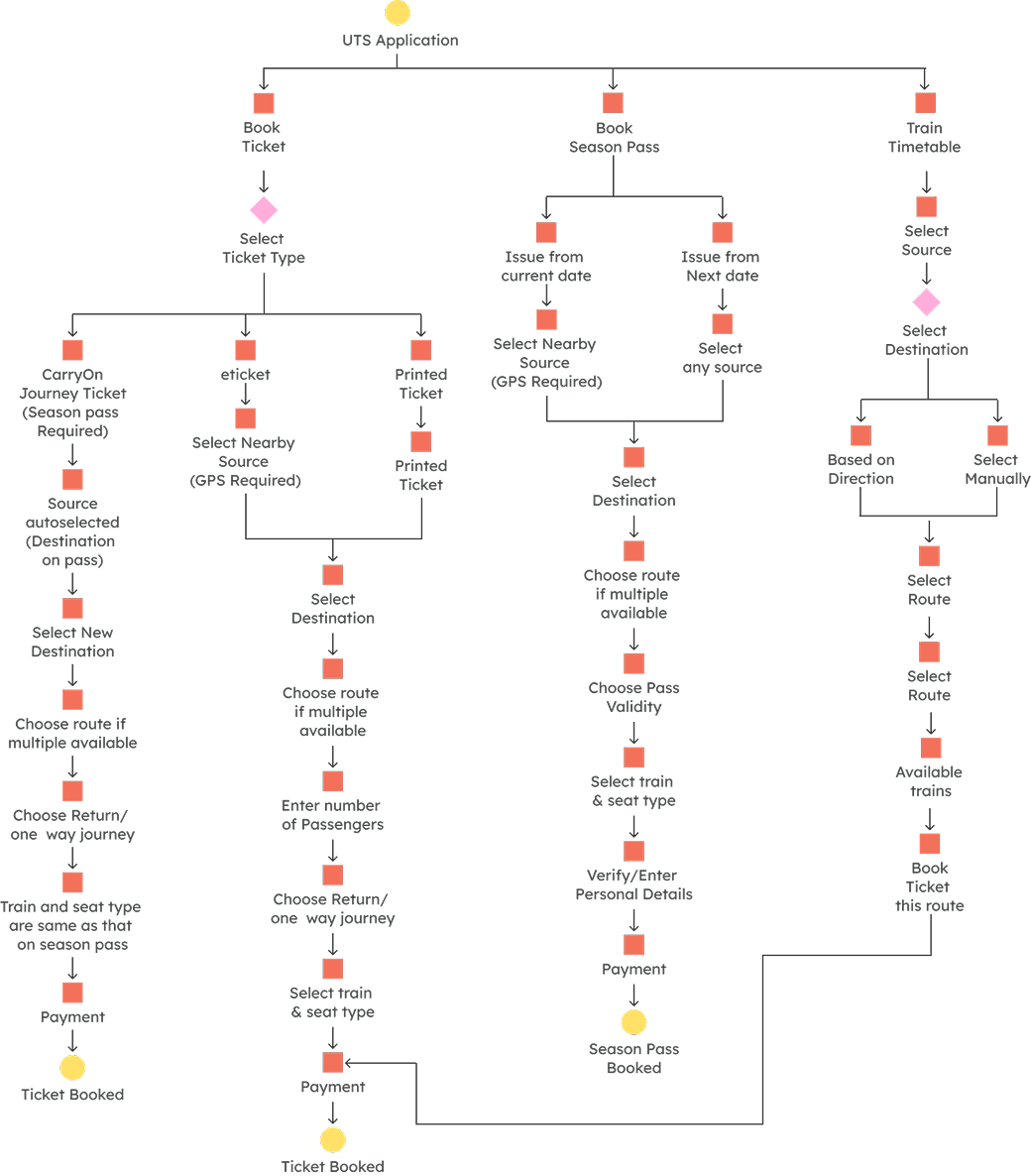 On the current app, train ticket booking is very time consuming. The user gets frustrated navigating through complicated user flows. The app doesn’t allow a continuation ticket for pass holders who want to travel past their marked destination station. As a result the pass holder has to either book a new ticket for the whole journey or de-board the train after reaching his destination to book an extension ticket. Also, Unnecessary login each time when the app is reopened. The outdated interface and design make the app unappealing to use.