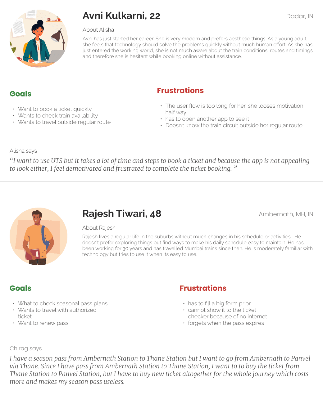 “Protagonist’s occasional commute to their book club in Mumbai looks like this- travel to nearest train station by bike - catch the train - take the bus - walk for 5 mins and repeat it while returning with millions of travel buddies. Now imagine their frustration while using an unoptimized ticket booking app for train travel which consumes major chuck of the travel duration .”